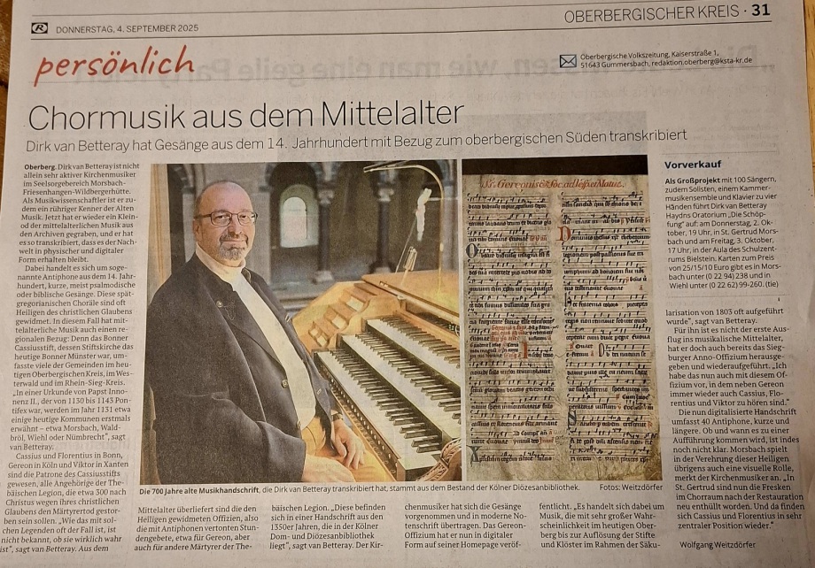 So lautet der Titel seines neuen Buches, das Dr. Dirk van Betteray am 21. September um 19.30 Uhr in der Stadtpfarrkirche St. Servatius verbunden mit einem Konzert der Öffentlichkeit vorstellen wird. Zwei Jahre lang hat sich der promovierte Musikwissenschaftler und Mittelalterfachmann mit den Gesängen zu Ehren des mittelalterlichen Kölner Erzbischofs beschäftigt, der sich nicht zuletzt durch den "Staatsstreich von Kaiserswerth" einen bleibenden Platz in der deutschen Geschichte gesichert hat. Anno hatte den noch minderjährigen Heinrich IV. dort geraubt und wurde so de facto Regent des Reiches, bis Heinrich erwachsen war.